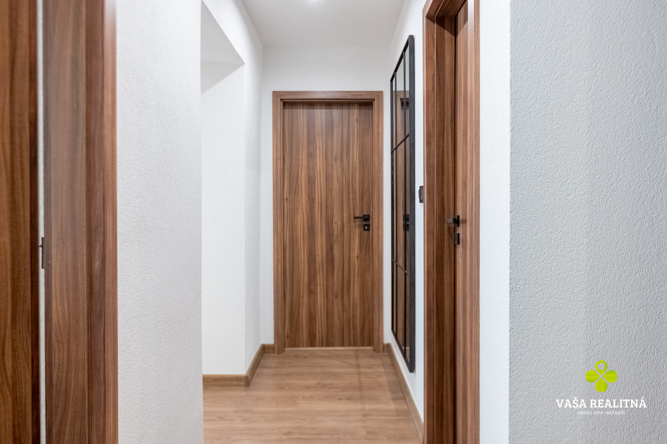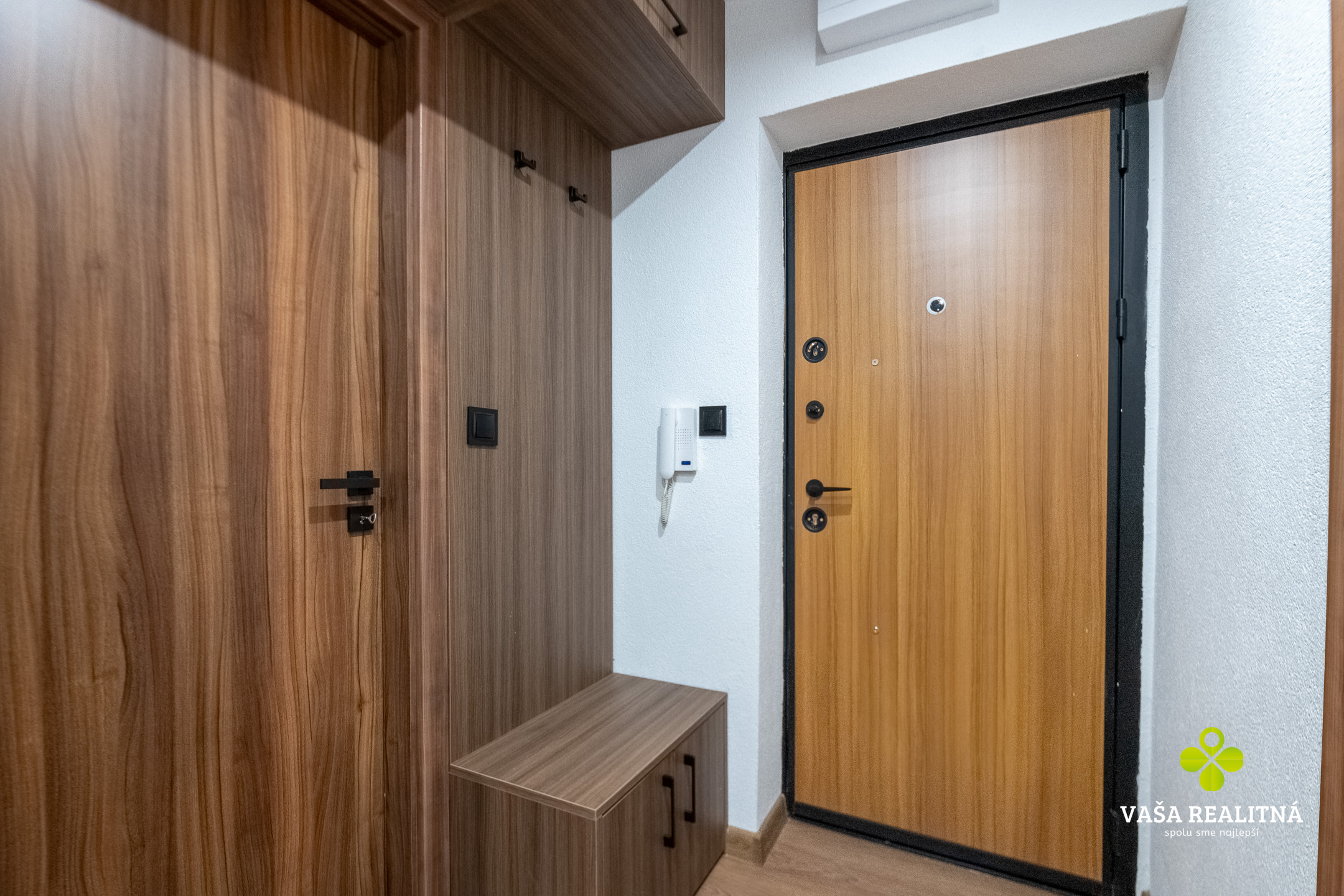 Vstup do bytu zabezpečujú bezpečnostné protipožiarne dvere. Podlahy v obytných miestnostiach veľkoplošné laminátové podlahy -aquastop, zvyšok tvoria keramické dlažby. Okná v celom byte plastové so žalúziami, doladené peknými závesmi a záclonami. V kúpeľni umiestnený moderný sprchový kút, umývadlo s úložným priestorom, vaňa a taktiež WC. Kuchyňu na mieru so vstavanými spotrebičmi dopĺňa jedálenský kút. Samozrejmosťou kompletne zrekonštruovaného bytu sú aj nové rozvody vody, elektroinštalácie, sadrokartónové stropy, stierky,kvalitné interiérové drevené dvere a ďalšie nadčasové prvky. Nezabudlo sa taktiež ani na úložný priestor ako vstavaná skriňa, šatník v chodbe.